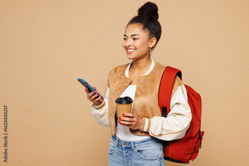 Young happy smart girl student wear casual clothes backpack bag hold books use mobile cell phone drink coffee isolated on plain pastel light beige background. High school university college concept.