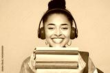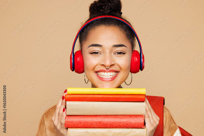 Close up young smart girl student she wear casual clothes backpack bag hold books listen to music in headphones isolated on plain pastel light beige background. High school university college concept.