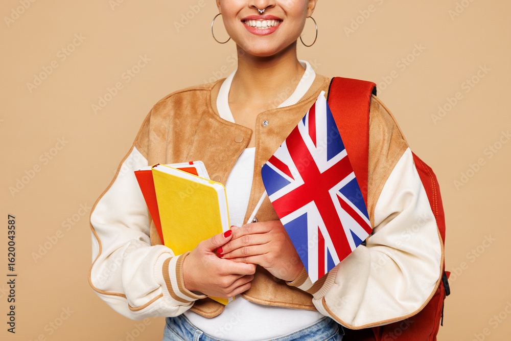 Close up cropped young smiling happy smart girl student wear casual clothes backpack bag hold books British flag isolated on plain pastel light beige background High school university college concept