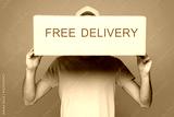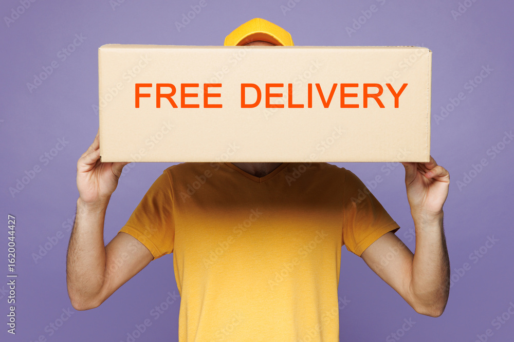 Professional guy employee man he wear yellow cap t-shirt uniform workwear work as dealer courier hold blank cardboard box with Free Delivery text isolated on plain purple background. Service concept.