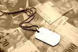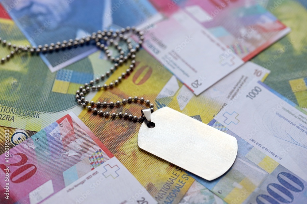 Swiss franc banknotes and military token. The current francs money bills and dogtags lies on table