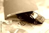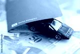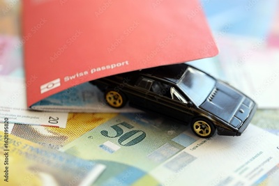 Swiss franc banknotes and toy car with passport. The current francs money bills and car with pass