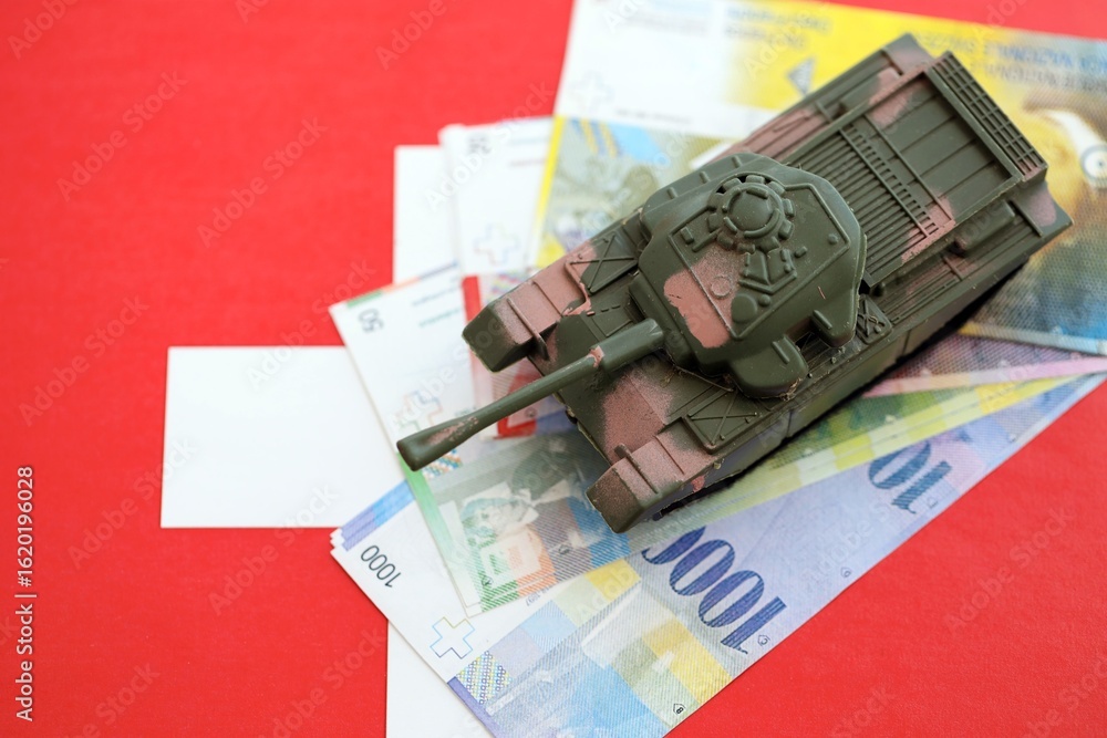 Swiss franc banknotes and toy tank on flag. The current francs money bills and tank lies on flag