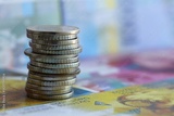 Swiss franc banknotes and coins. The current francs money bills and coins lies in big amount