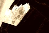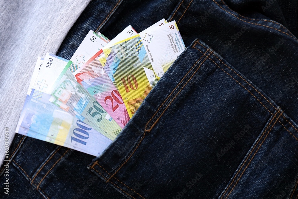 Swiss franc banknotes in denims pocket. The current francs money bills lies in jeans pocket