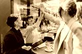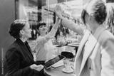 Businesswomen discussing work and celebrating achievements over drinks at a cafe.