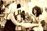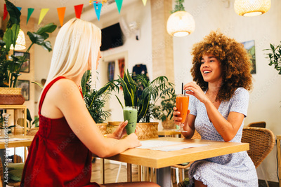 Two happy female friends enjoying healthy smoothies in a modern decorated restaurant