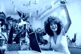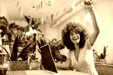 Young woman calling waiter raising hand and holding menu in a decorated restaurant