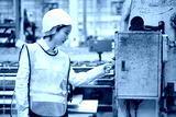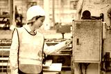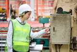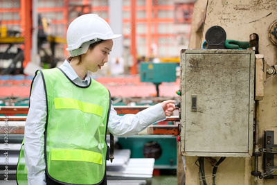 Engineer or worker working at machine control panel and push a button in the factory