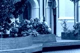 Wooden city bench surrounded by greenery and blooming hydrangeas in front of a historic townhouse.