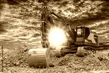 Ein Bagger belädt einen LKW und schaufelt eine Baugrube für das Fundament von einem neuen Wohnhaus - FOTOMONTAGE