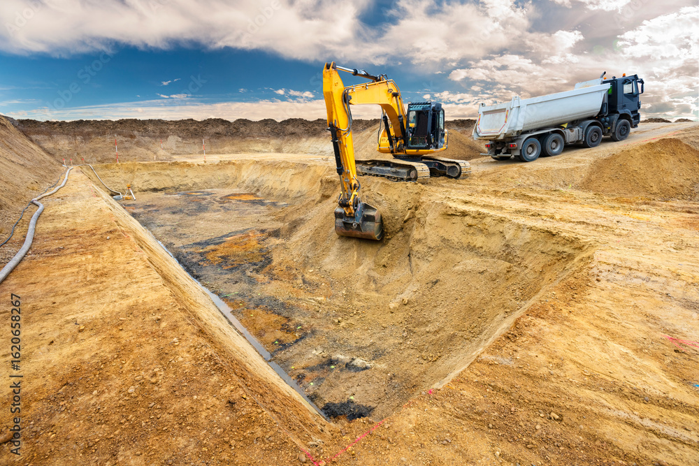 Ein Bagger belädt einen LKW und schaufelt eine Baugrube für das Fundament von einem neuen Wohnhaus - FOTOMONTAGE