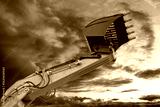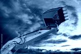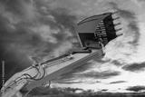 Ein Bagger belädt einen LKW und schaufelt eine Baugrube für das Fundament von einem neuen Wohnhaus - FOTOMONTAGE