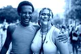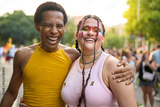 Happy couple laughing and embracing at pride festival