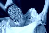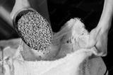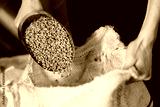 Green coffee beans being poured into burlap sack in factory setting