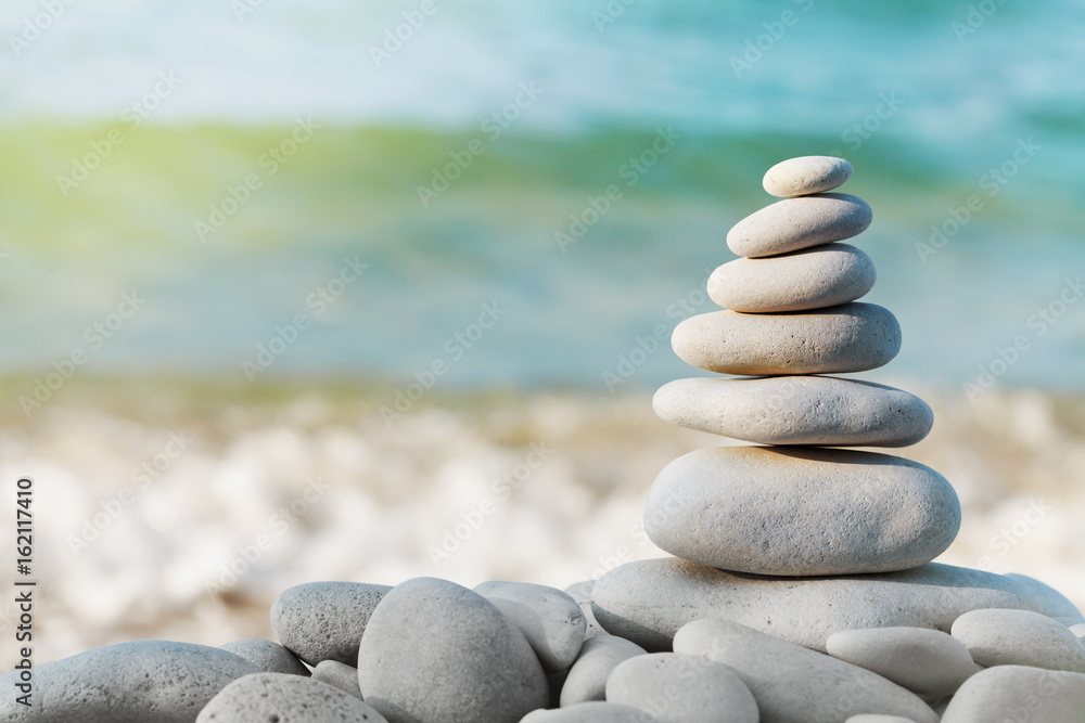 Stack of white pebbles stone against blue sea background for spa, balance, meditation and zen theme.