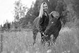 Smiling woman feeding her arabian horse with snacks in the field