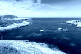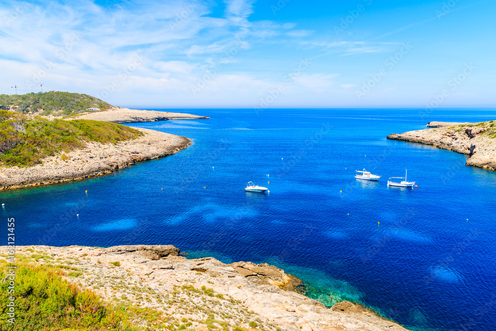 Motor and fishing boats on blue sea in Cala Portinatx bay, Ibiza island, Spain