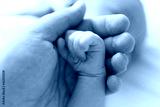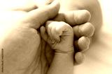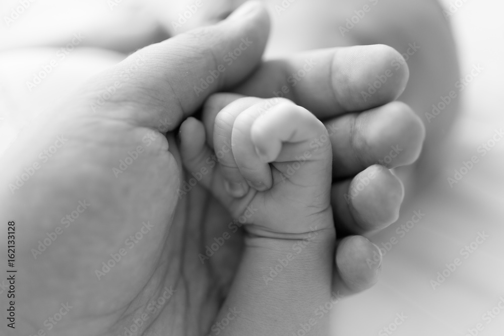 Closeup black and white shot of father holding newborn baby hand. Image with soft focus