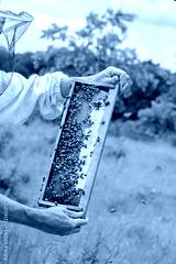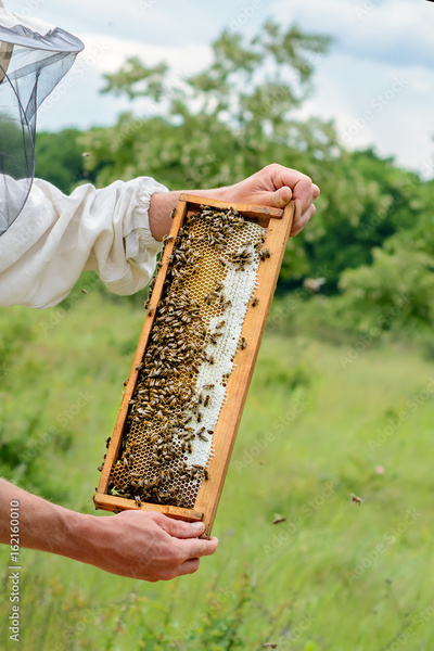 The beekeeper takes out from the hive honeycomb filled with fresh honey. Apiculture.