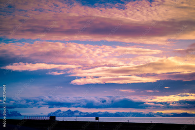 The setting sun in the clouds in the mountains of Spitsbergen Svalbard Longyearbyen orange sunset