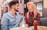 Loving couple sitting in the cafe and eating pizza. Consumerism, food, lifestyle concept