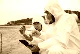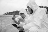 Environmental scientists conducting water quality testing along a shoreline on a cloudy day