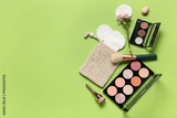 Composition with cotton pads, flower, makeup products and brush on green background