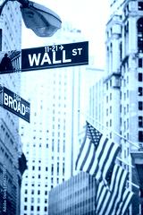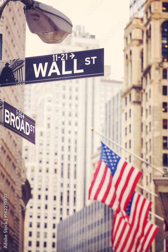 Wall Street and Broad Street signs with American flag in distance, shallow depth of field, color toning applied, New York City, USA.