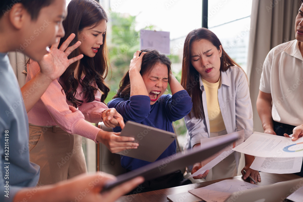 Asian business professionals confronting overwhelming stress frustration during critical office meeting discussion