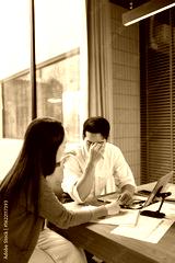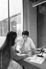 Asian adult business colleagues male female facing significant work problem stress receiving comfort support discussing solutions modern office workplace