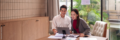 Asian professionals collaborate business meeting analyzing data on tablet modern office discussing strategy corporate environment productivity team work digital transformation