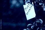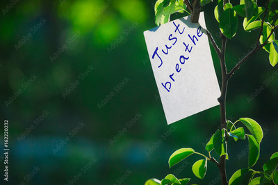 Motivating phrase just breathe. On a green background on a branch is a white paper with a motivating phrase.