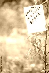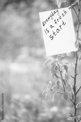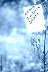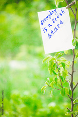 Motivating phrase Everyday a fresh start. On a green background on a branch is a white paper with a motivating phrase.