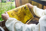 Beekeeper working with bees in beehive, showing the frame with honeycombs