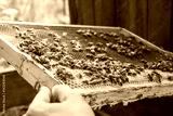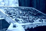 Beekeeper working with bees in beehive, showing the frame with honeycombs