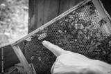 Beekeeper working with bees in beehive, showing the frame with honeycombs
