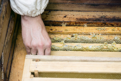 Beekeeper working with bees in beehive, showing the frame with honeycombs