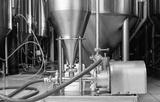 Industrial food pump in brewery fermentation tanks, process of mixing beer and juices to produce craft drink IPA