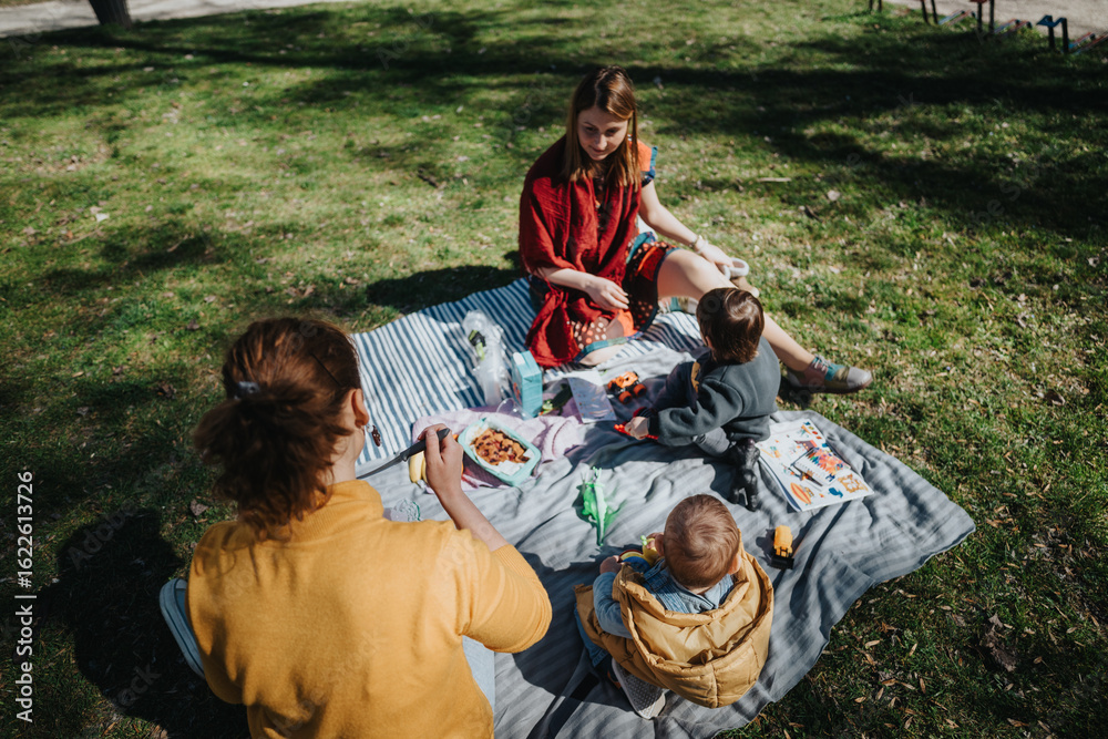 A top view of a family having a picnic on the grass, sitting on a blanket, enjoying food, sunshine, and outdoor fun in a park.