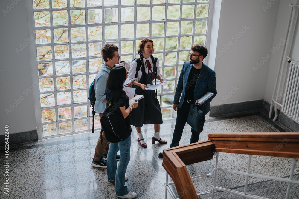 A group of diverse students consult with a professor in a bright, modern university hallway. They are discussing academic subjects, fostering learning and collaboration in an educational setting.