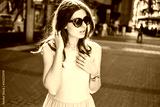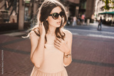 Close-up portrait of a slender young girl blogger beautiful brunette in downtown dusseldorf in a pastel dress and a lady wearing sunglasses walking poses and smiling on the sunset