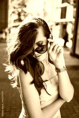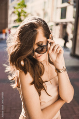 Close-up portrait of a slender young girl blogger beautiful brunette in downtown dusseldorf in a pastel dress and a lady wearing sunglasses walking poses and smiling on the sunset