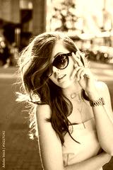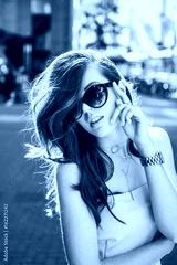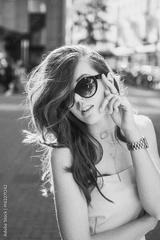 Close-up portrait of a slender young girl blogger beautiful brunette in downtown dusseldorf in a pastel dress and a lady wearing sunglasses walking poses and smiling on the sunset