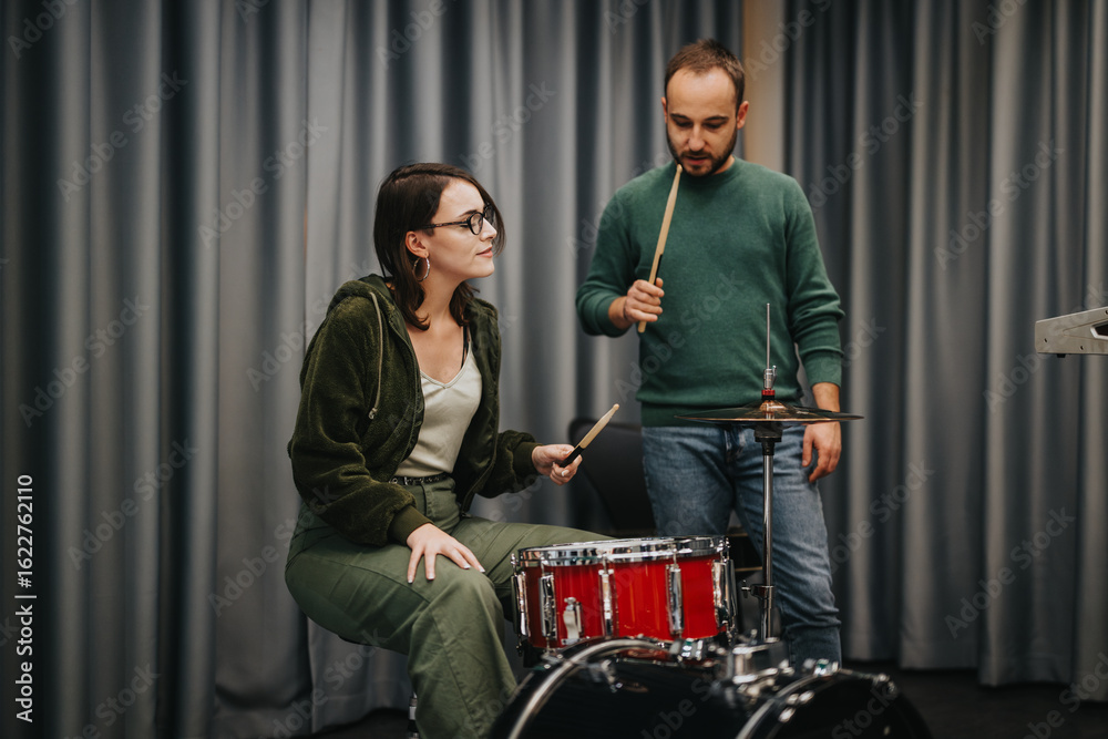 A musician plays the drum as another person discusses technique in a studio environment, highlighting teamwork and practice in music.