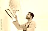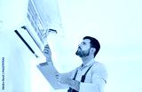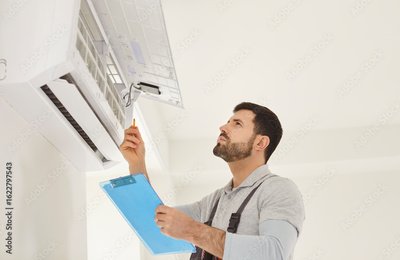 Professional technician holding screwdriver and clipboard checking air conditioner after installing, cleaning or repairing. Male repairman providing maintenance of cooling system at client home.