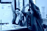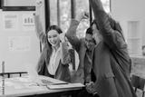 Happy business people celebrate the success of a project, happy coworkers and the workplace. Celebrate at a meeting.