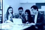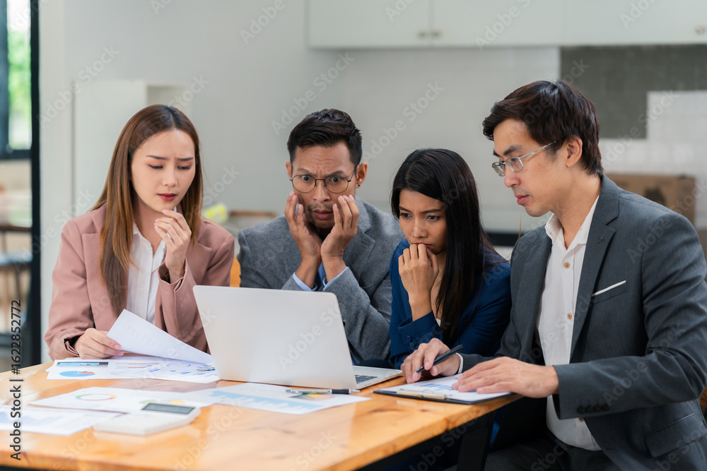 Group of happy Asian business people in suits brainstorming analyzing financial statistics. Meeting, discussion, corporate concept in office.