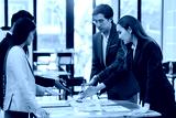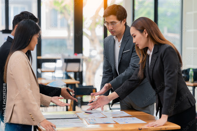 Group of happy Asian business people in suits brainstorming analyzing financial statistics. Meeting, discussion, corporate concept in office.