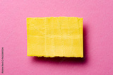 One single yellow torn ripped wrinkled crumpled blank paper note with shadow and copy space for text on pink background